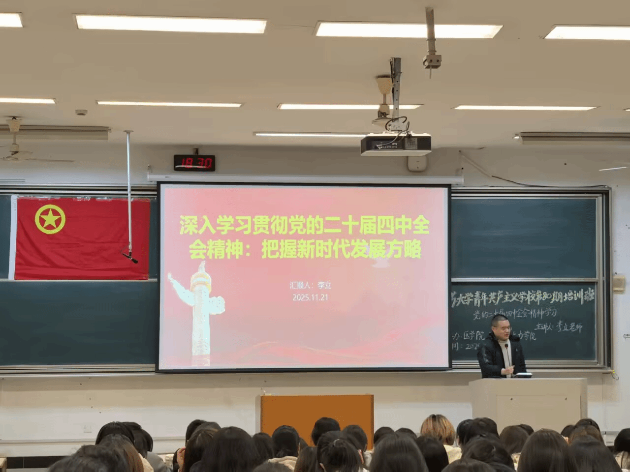 为引导团员青年深入领会党的二十届四中全会精神,筑牢思想根基、勇担时代使命,2025年11月21日下午18时30分,伟德国际1946联合医学院、土力学院在讲堂群103举办了以“党的二十届四中全会精神学习”为主题的第80期团校培训班第一讲。本次团课由马克思主义学院李立老师主讲,伟德国际1946、医学院和土力学院的班团干部共同参加。