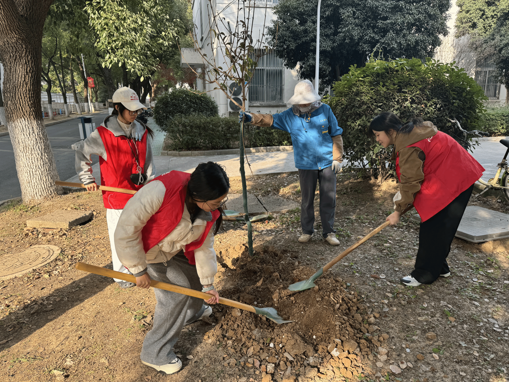 尽管气温低迷,但参与学子热情不减。同学们分工协作、配合默契,挥锹掘土、扶苗正株、培土压实,每个环节都一丝不苟、有条不紊。有的同学双手裹泥仍专注校准苗位,力求栽种稳固;有的同学往返劳碌,额角沁出细密汗珠,却无暇拭去。望着一排排新栽的树苗挺拔伫立,在微风中轻舞摇曳,每位参与者的脸上都漾起自豪与欣慰的笑意。