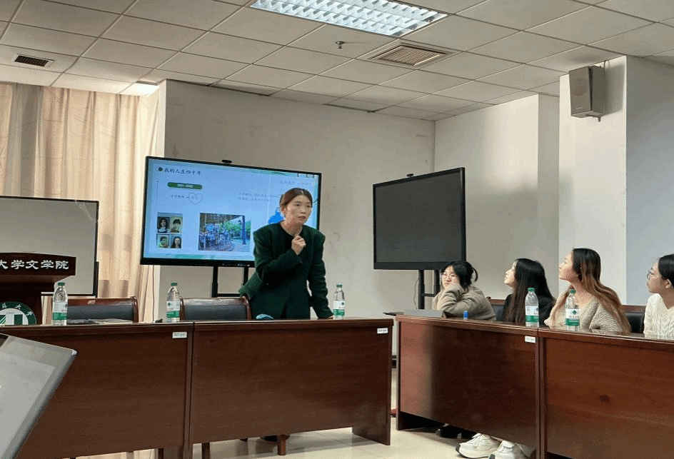 在温暖的氛围中,黄雪云以“我的人生四十年:从个体探索到共同体构建”为题,展开了一场真诚的分享。黄雪云没有罗列学术成果,而是以“反向选择”为线索,复盘了自己充满转折的人生路径:从放弃小学教师编制、外企高管职位,到背井离乡赴韩留学,再到回国深耕国际中文教育。她坦言,科研的种子,往往萌芽于那些看似不务正业的好奇与闲聊。从她的讲述中,同学们渐渐了解到江小语工作室的核心,就是营造一个安全、包容、鼓励试错的“非正式”环境,让师生成为彼此学术探索路上真正的同行者。黄雪云运营公众号、带领学生从课堂疑问发展出研究项目的案例,让“非正式科研”变得可知可感。